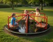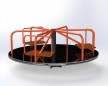 Классическая круговая карусель с посадочными платформами и защитными поручнями. Конструкция рассчитана на одновременное катание нескольких детей и обеспечивает устойчивость и безопасность во время вращения.