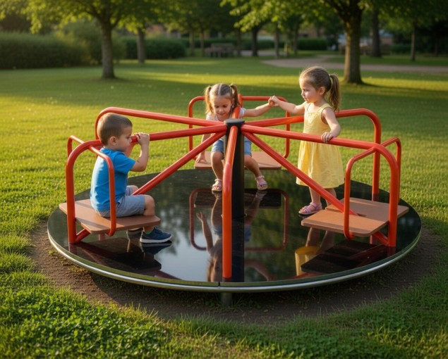 Центральная ось с прочным подшипниковым механизмом гарантирует плавный ход, а удобные сиденья и поручни обеспечивают надежную фиксацию. Подходит для установки на детских игровых площадках во дворах, парках и образовательных учреждениях.