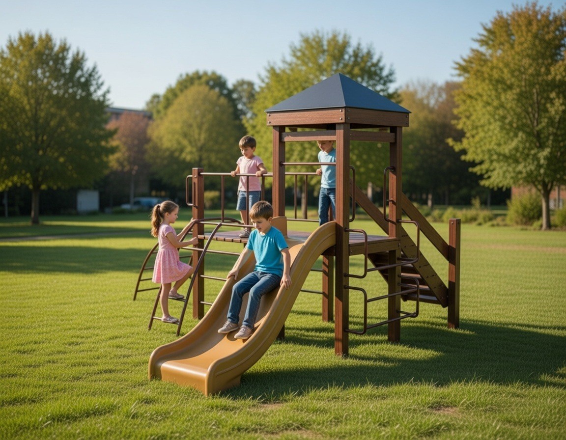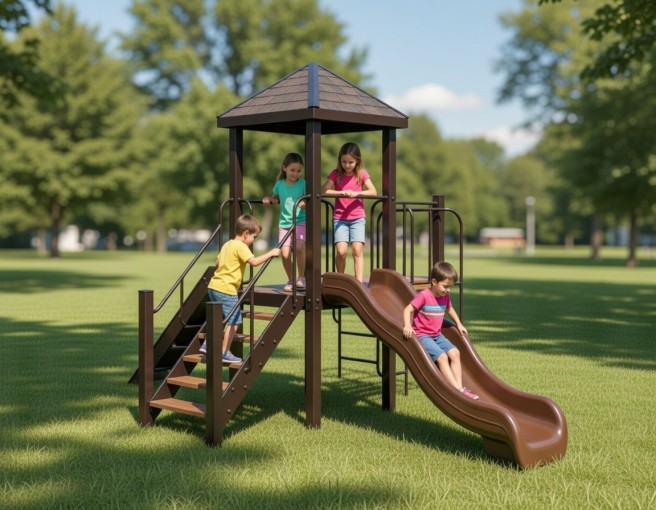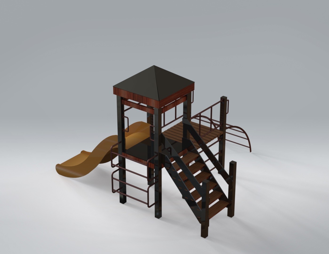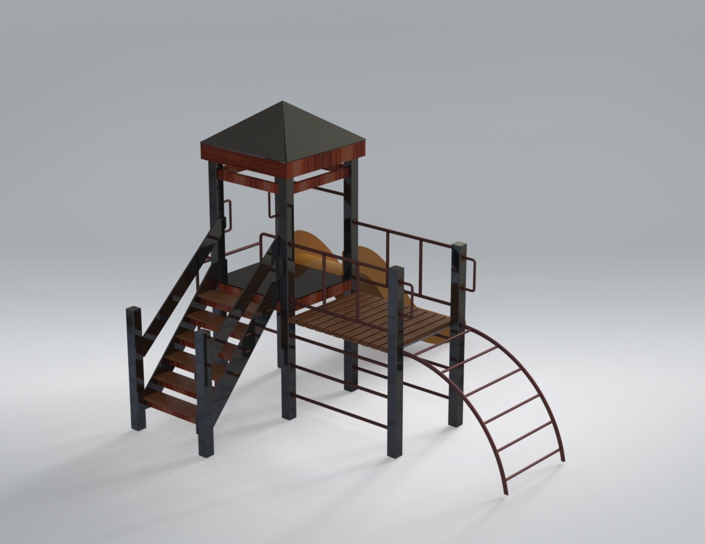 Прочный металлический каркас в сочетании с деревянными настилами придаёт комплексу надёжность и аккуратный внешний вид.