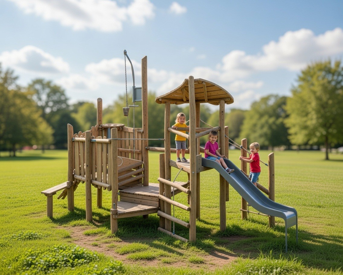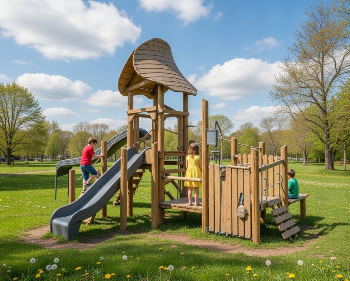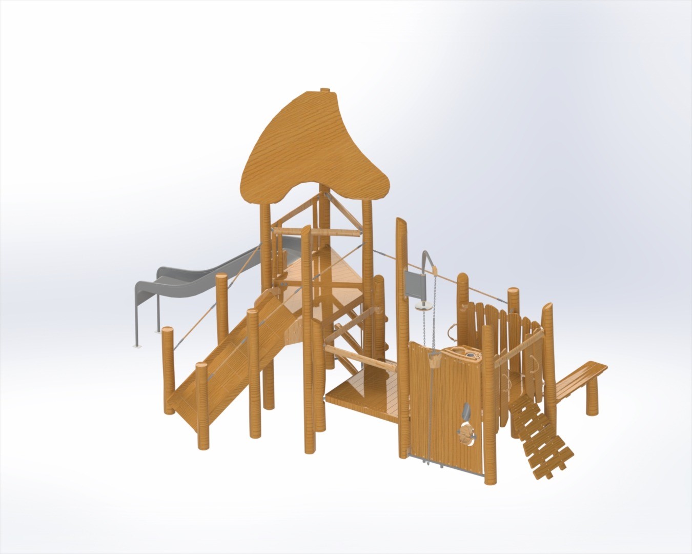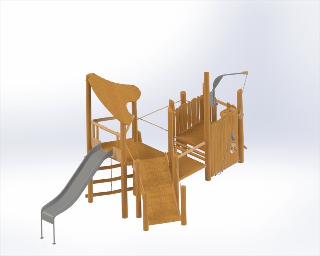 Конструкция развивает ловкость, координацию и смелость: дети поднимаются по ступеням, переходят по мосту, исследуют игровые элементы и с удовольствием скатываются с горки. Натуральные материалы и плавные формы делают комплекс гармоничной частью любого парка или дворовой территории, а продуманная планировка позволяет играть одновременно нескольким детям.