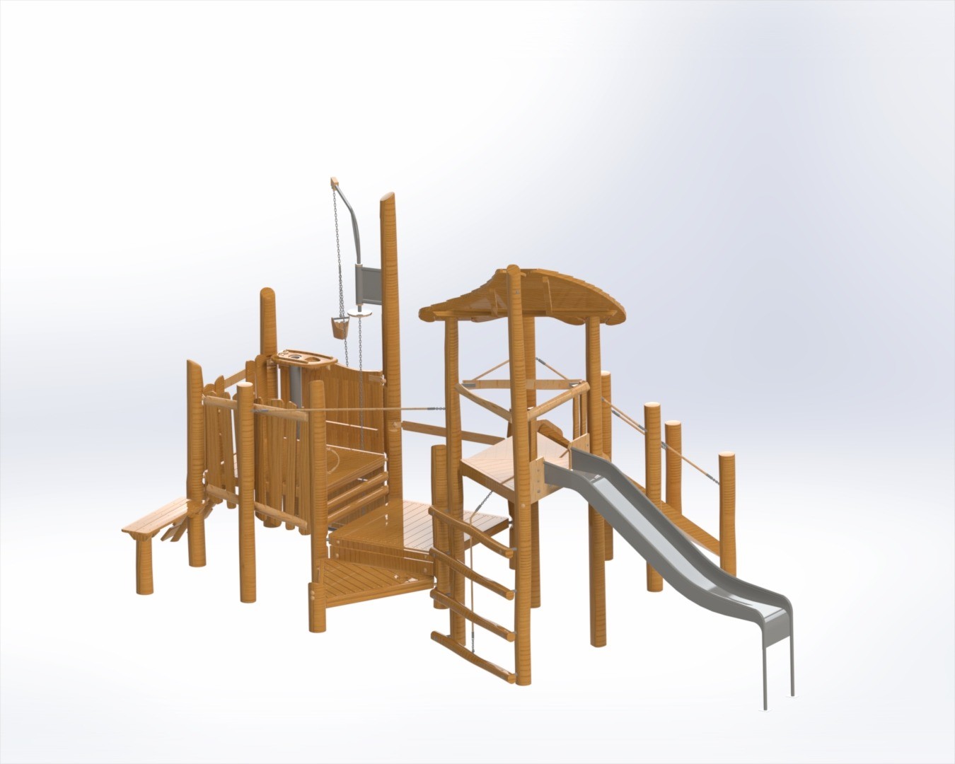 это многоуровневое игровое пространство, выполненное в натуральной деревянной стилистике и вдохновлённое атмосферой лесных маршрутов и тайных троп. Комплекс объединяет игровые башни, соединённые мостиком, удобные лестницы и горку, создавая насыщенную и разнообразную зону для активных игр.