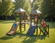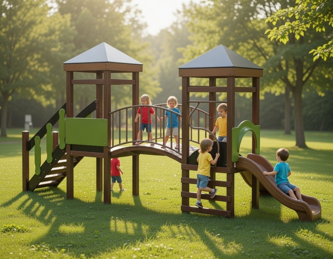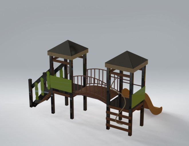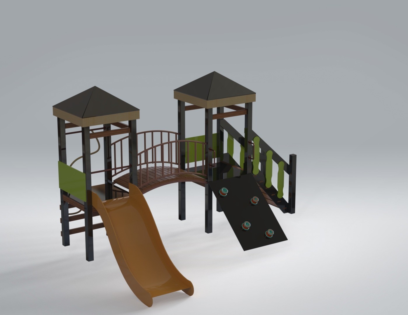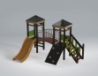 Башни соединены изящным мостиком, который превращает переход между уровнями в увлекательное приключение. Комплекс оснащён плавной горкой, наклонной скалодромной панелью с зацепами и удобной лестницей с декоративными ограждениями. Такое сочетание элементов развивает координацию, силу и уверенность в движениях.