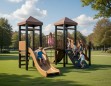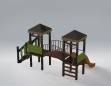 Детский игровой комплекс (4,640 м х 3,500 м х 2,900 м) с гармоничной архитектурой и продуманной функциональностью. Конструкция выполнена в спокойной природной палитре: тёмные опоры и древесные элементы создают ощущение надёжности, а зелёные акценты добавляют свежести и визуального баланса.