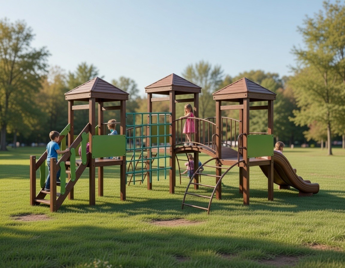 В состав входят игровые башни с защитными крышами, лестницы, арочный лаз, вертикальная сетка, мостик и горка. Такое сочетание элементов развивает у детей координацию, ловкость, силу и пространственное мышление, а также стимулирует сюжетно-ролевые игры и командное взаимодействие.
