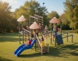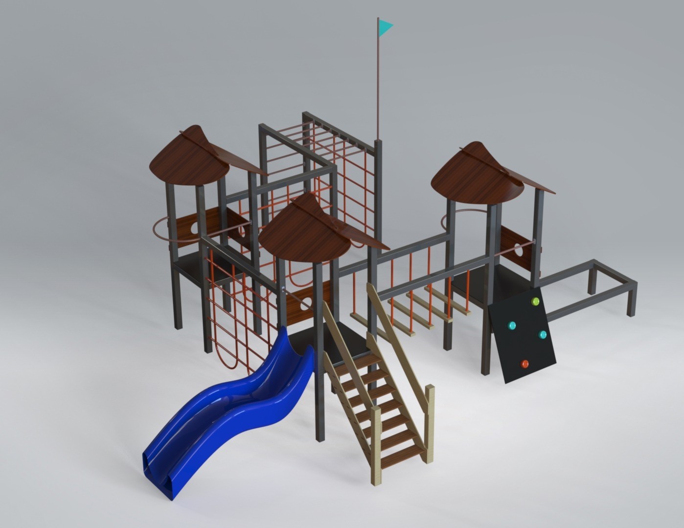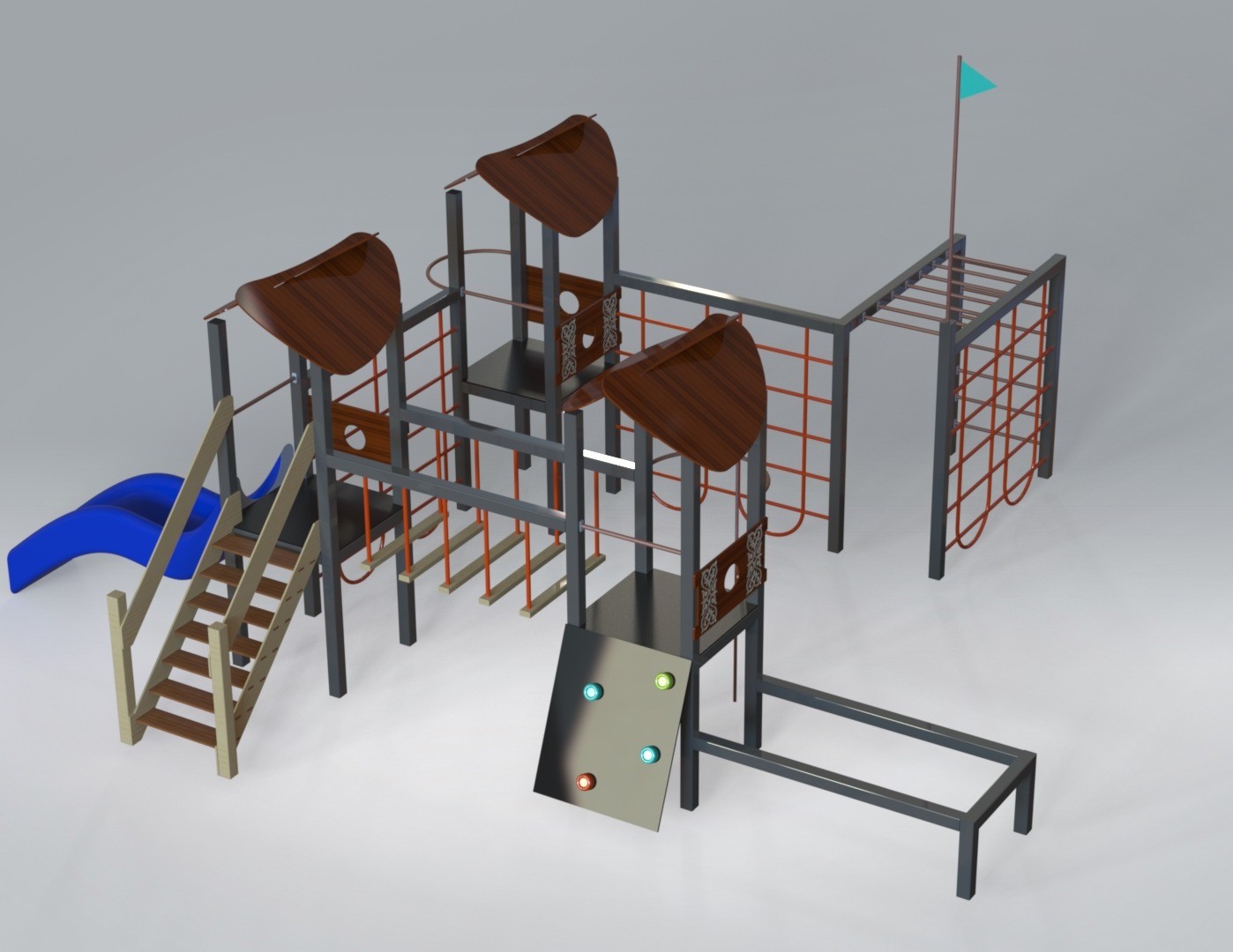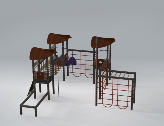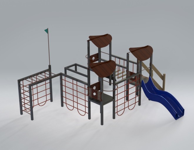 Детский игровой комплекс (7,300 м х 8,565 м х 4,300 м) — многоуровневая игровая конструкция, созданная для активных и увлекательных детских игр. Комплекс объединяет несколько башен с навесами, соединённых переходами, лестницами и лазательными элементами, что превращает игру в настоящее приключение.