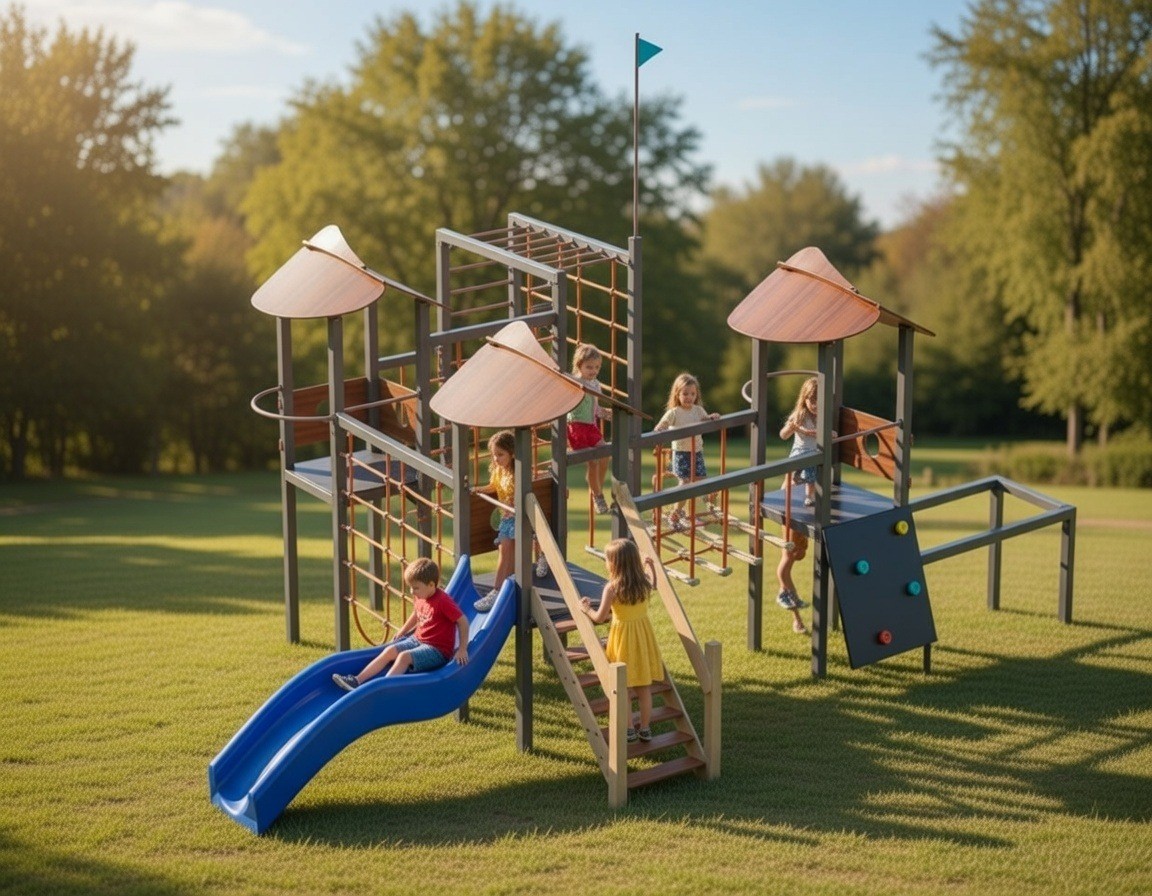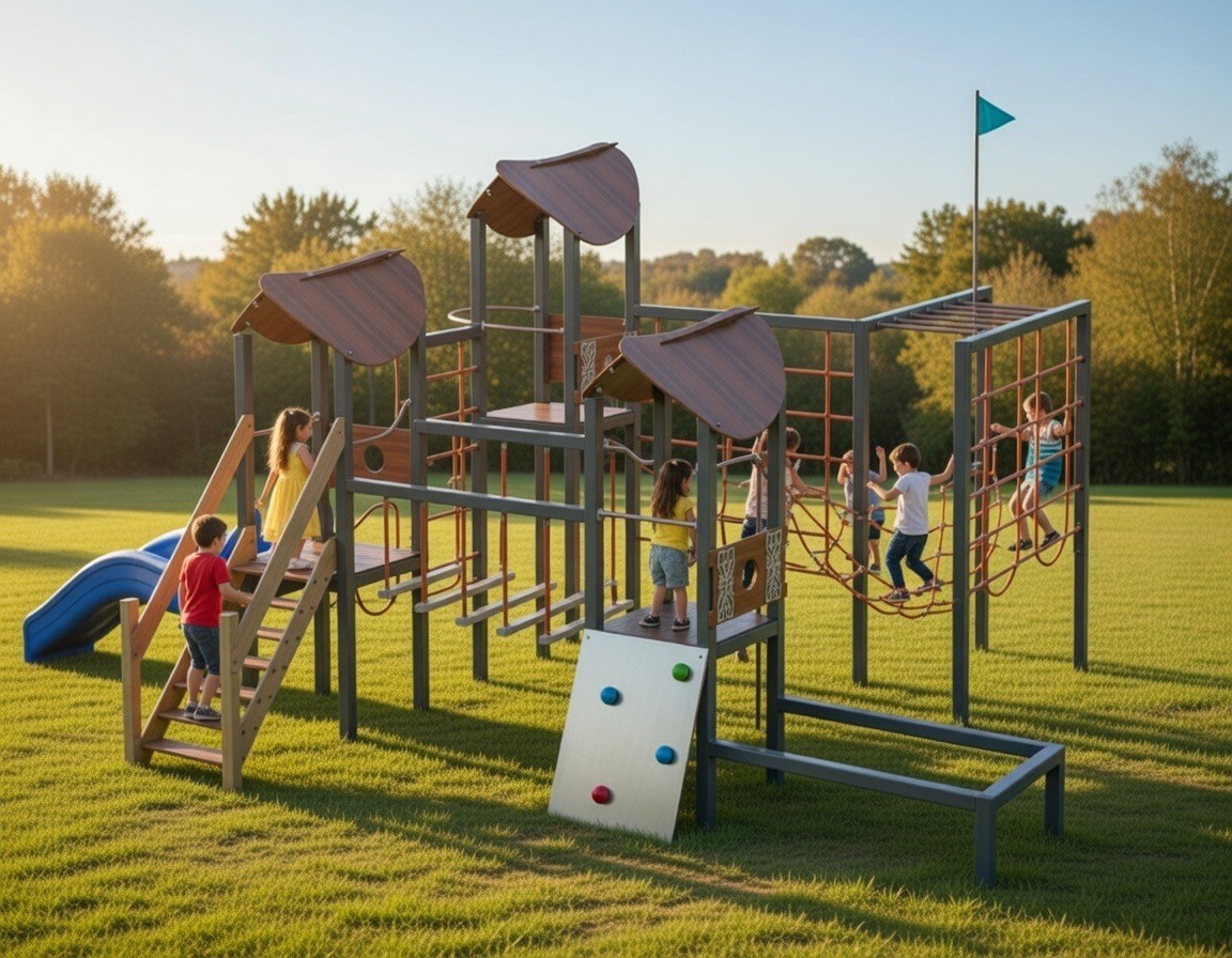 Детский игровой комплекс (7,300 м х 8,565 м х 4,300 м) отлично подойдёт для дворовых территорий, парков и детских учреждений, становясь центром притяжения для активных игр и командных приключений.