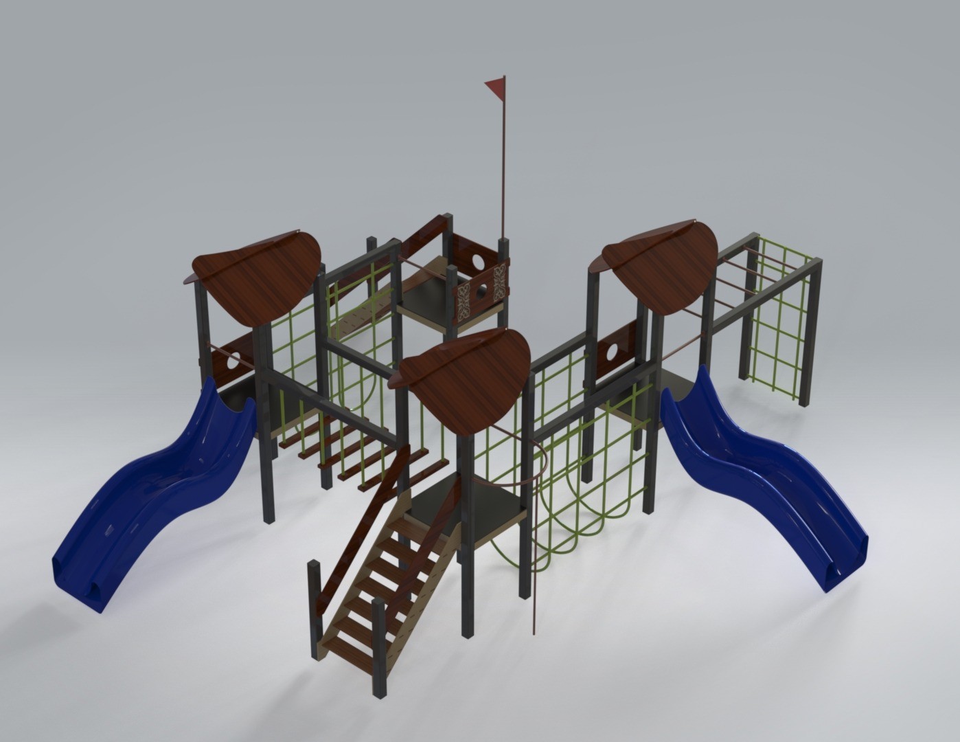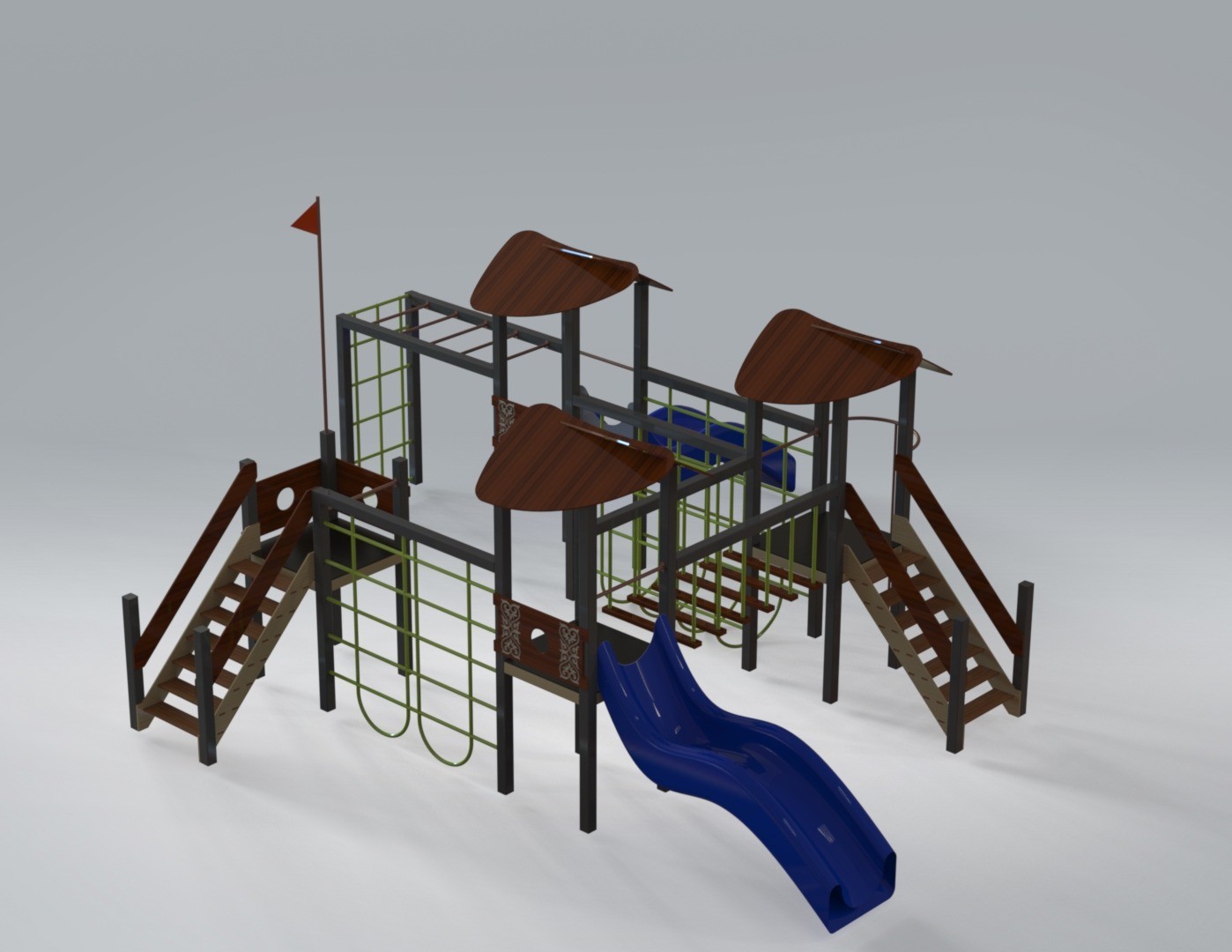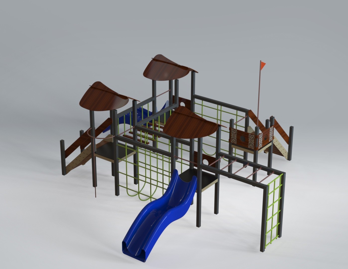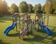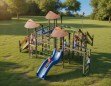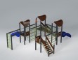 Детский игровой комплекс (8,780 м х 7,855 м х 3,800 м) — это многоуровневая игровая конструкция, созданная для активных и увлекательных игр. Комплекс объединяет несколько башен с навесами, соединённых переходами, лестницами и лазательными элементами, формируя настоящий маршрут для маленьких исследователей.