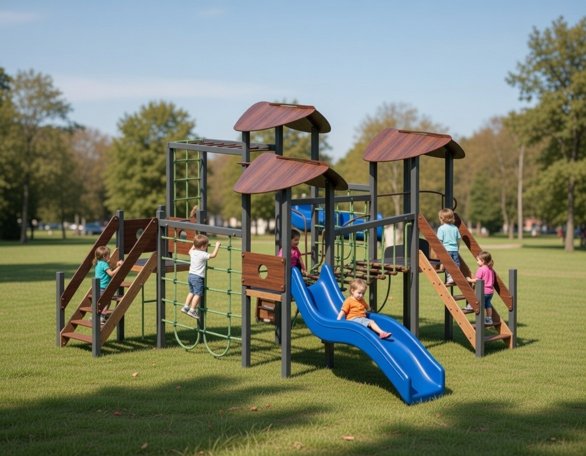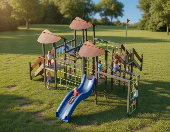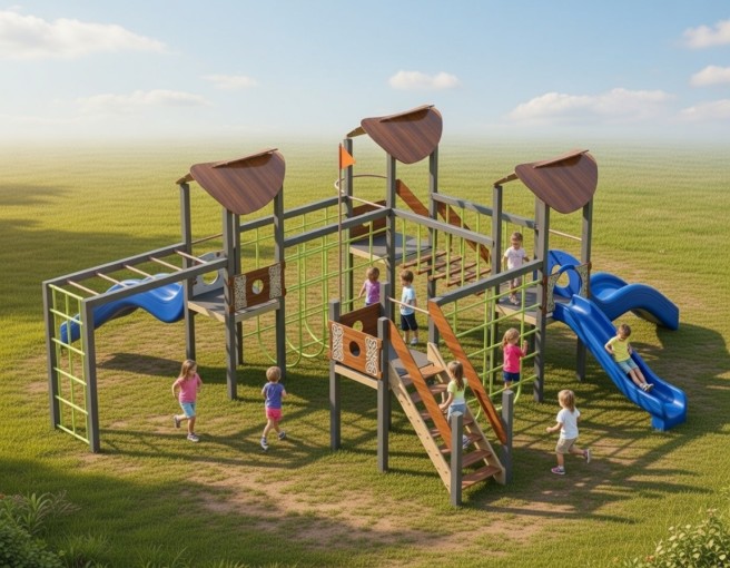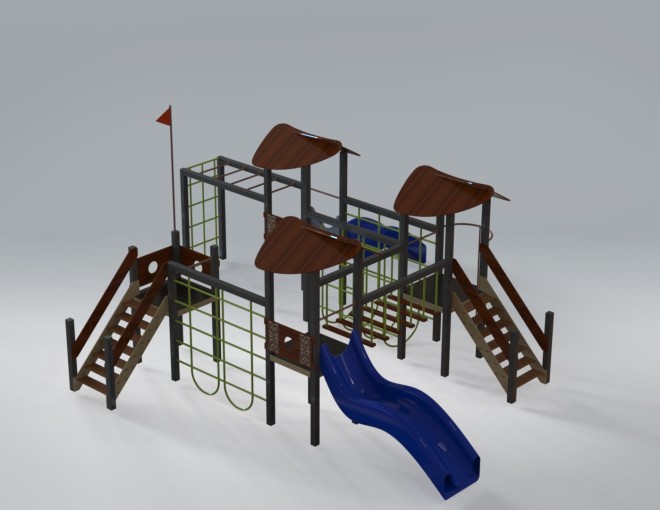 Разнообразие игровых зон — горка, сетки для лазания, лестницы и переходы — способствует развитию ловкости, координации движений и физической активности. Компоновка комплекса поощряет командную игру, фантазию и самостоятельное исследование пространства.