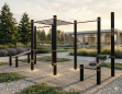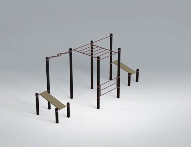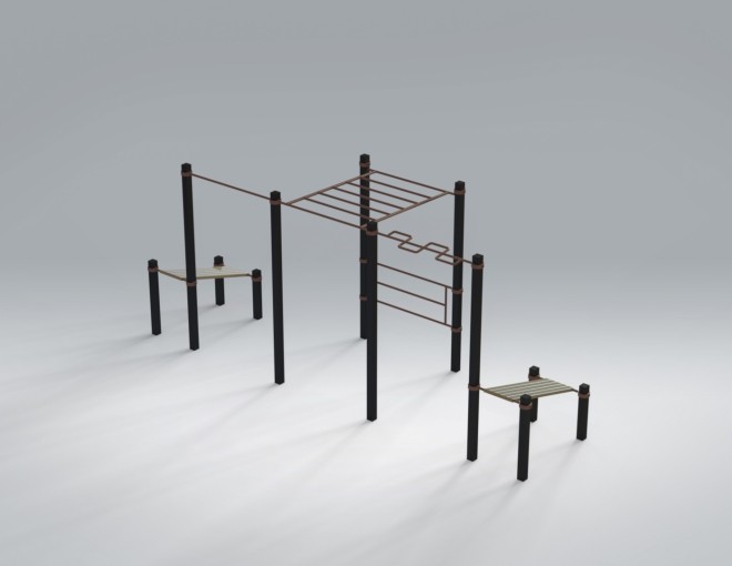 Спортивный комплекс (6,86 м х 2,15 м х 2,50 м) — универсальная уличная конструкция для активных тренировок и функциональных упражнений. Комплекс выполнен в минималистичном стиле и включает в себя турники разной высоты, рукоход, перекладины и платформы для опорных упражнений.