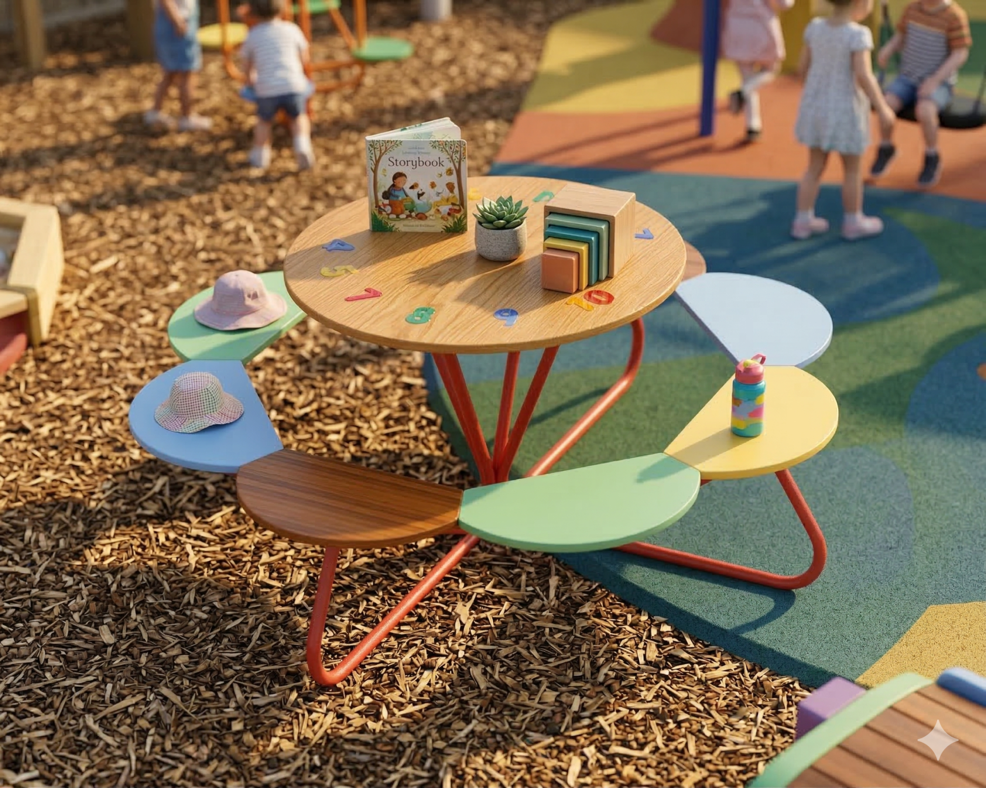 Прочная металлическая основа гарантирует устойчивость конструкции, а столешница и сиденья выполнены из износостойких материалов, устойчивых к атмосферным воздействиям. Подходит для парков, дворов, школьных территорий и зон отдыха.