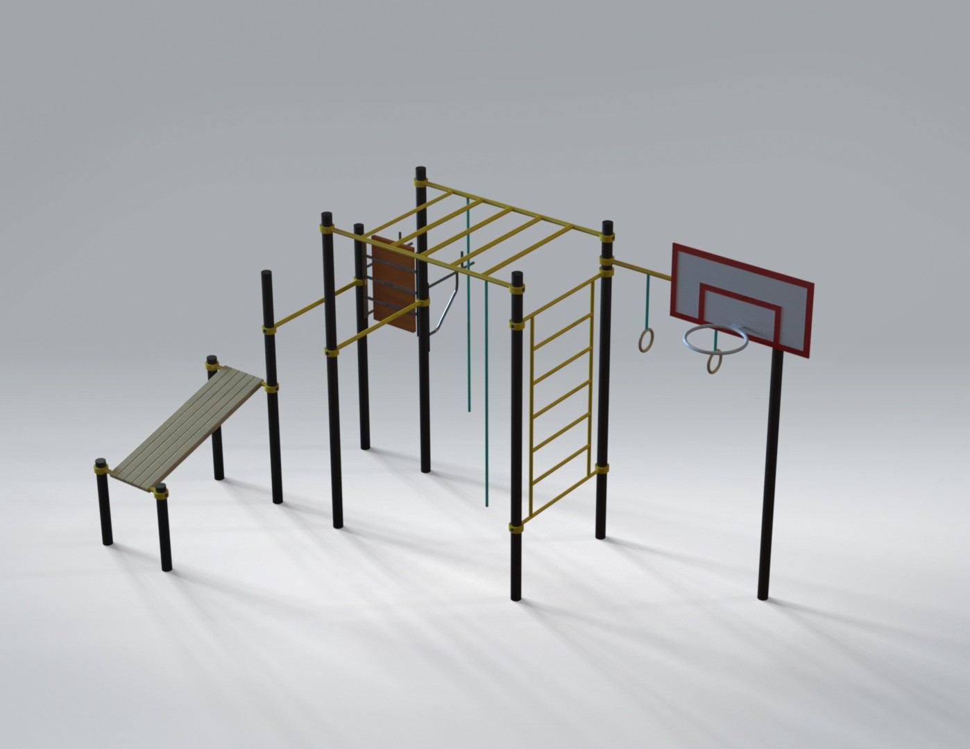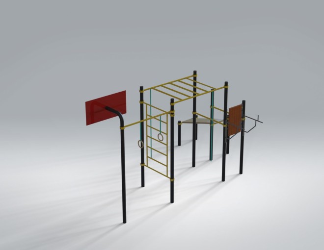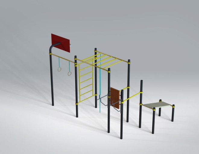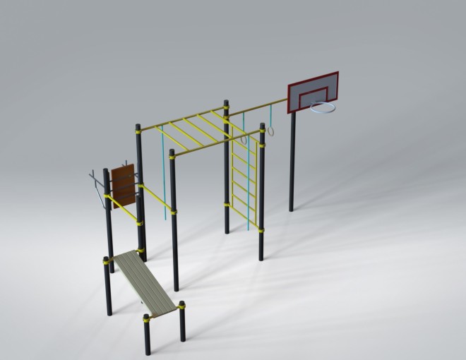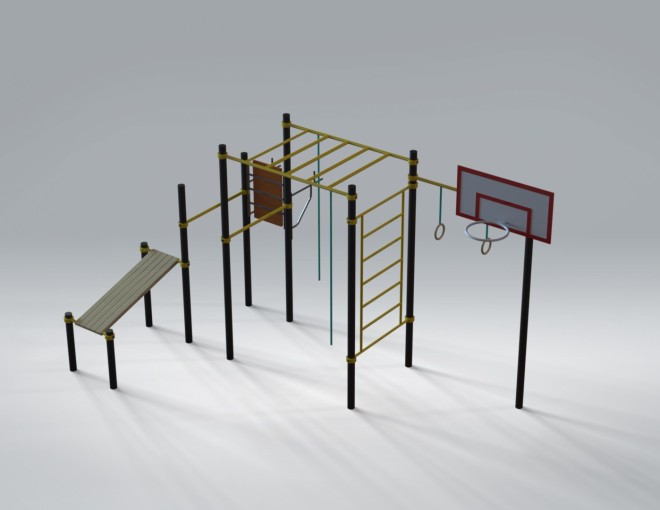 Спортивный комплекс (5,57 м х 3,32 м х 2,80 м) — многофункциональная уличная площадка, объединяющая элементы воркаута и игровых тренировок. Конструкция включает рукоход, турники, шведскую стенку, гимнастические кольца, скамью для упражнений и баскетбольное кольцо, что делает занятия разнообразными и динамичными.