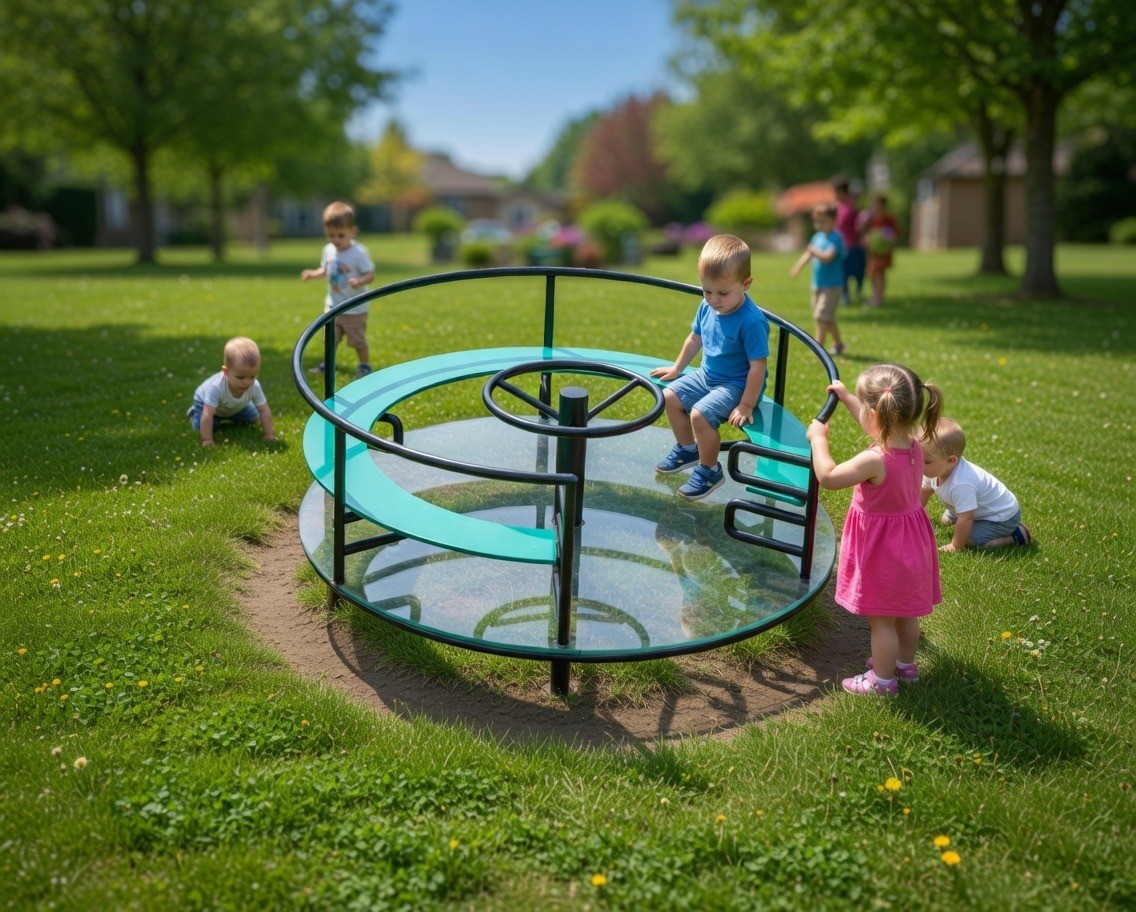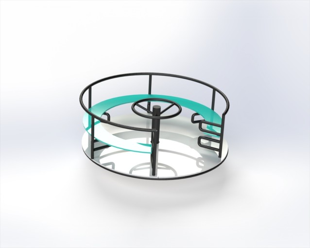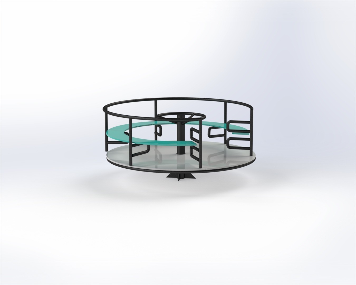 Круговой игровой элемент с поручнями и центральной опорой, предназначенный для активных игр с вращением. Конструкция позволяет детям удерживаться за поручни и совместно приводить элемент в движение, развивая чувство равновесия, координацию и командное взаимодействие.